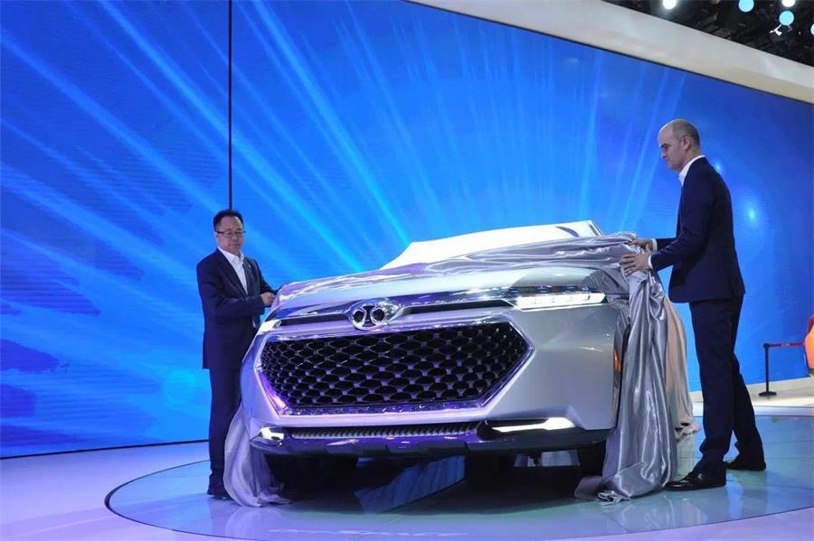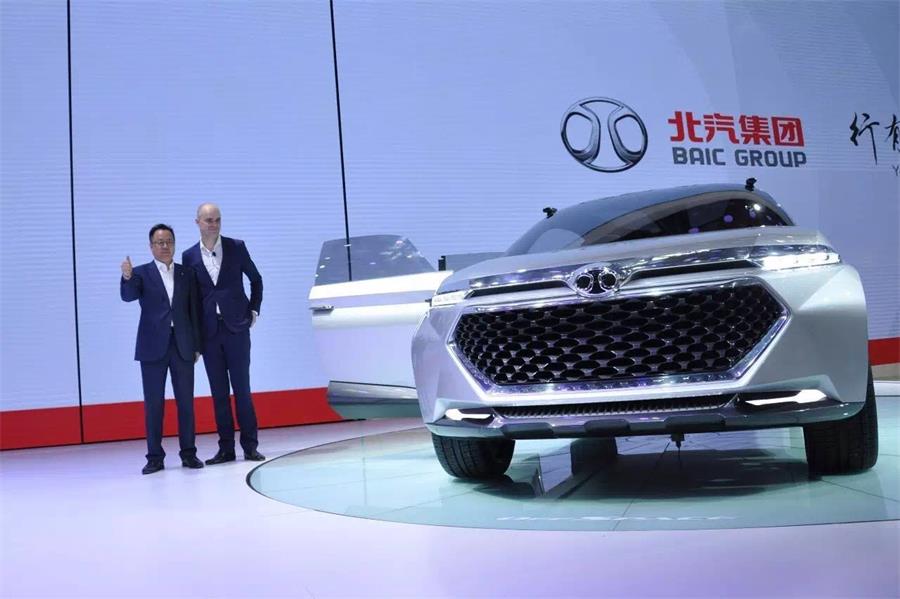 北京汽車(chē)股份有限公司總裁李峰、股份研究院設(shè)計(jì)總監(jiān)Lowie vermeersch為概念車(chē)OffSpace揭幕