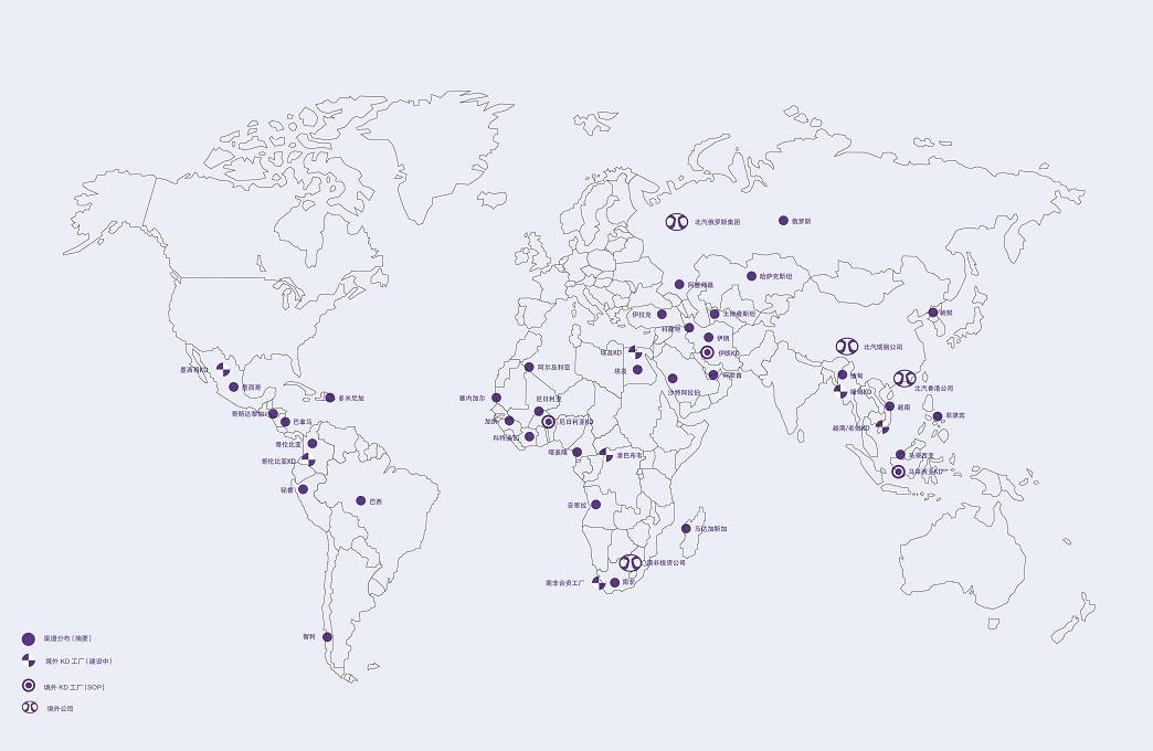 北汽集團響應國家“一帶一路”倡議,在海外不斷落子,努力實現“世界北汽”的戰略構想。北汽集團已在全球47個國家搭建銷售網絡154家、建設海外產業基地4家、境外公司7家、KD項目22個。“借助‘一帶一路’發展自主品牌,實現結構調整和產業轉型升級、加快國際化進程,將為北汽集團走向世界提供前所未有的機遇與支撐。”