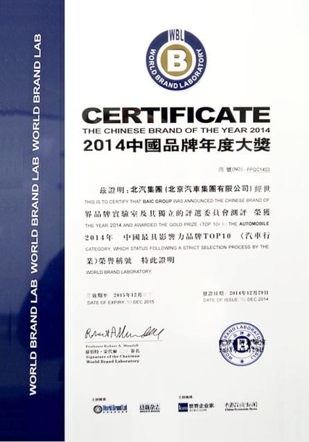 12月29日, 2014“中國品牌年度大獎”頒獎典禮在京舉行,北京汽車集團(tuán)有限公司(簡稱北汽集團(tuán))榮獲中國品牌年度大獎。這也是北汽集團(tuán)2014年自躋身《中國500最具價(jià)值品牌》后再度榮獲品牌大獎。