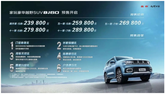 北京越野為BJ60打造了極富誠意的多重購車禮:支付3000元訂金膨脹至6000元抵扣款;終身免費保養,免費道路救援,整車5年或10萬公里超長質保;貸款購車2年0息,至高12000元貼息;置換補貼至高12000元、6折選購原值萬元家玩露營包。